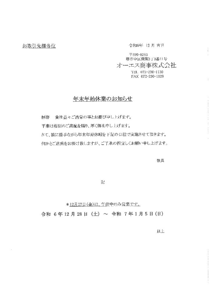 2024年12月3日 / 最終更新日 : 2024年12月3日 ossyoji お知らせ 年末年始の休暇について 投稿者プロフィール ossyoji 最新の投稿 お知らせ2025.12.02サイン&ディスプレイショーへ出展しました! お知らせ2025.12.02年末年始の休暇について お知らせ2024.12.03年末年始の休暇について お知らせ2024.04.17GW休暇について